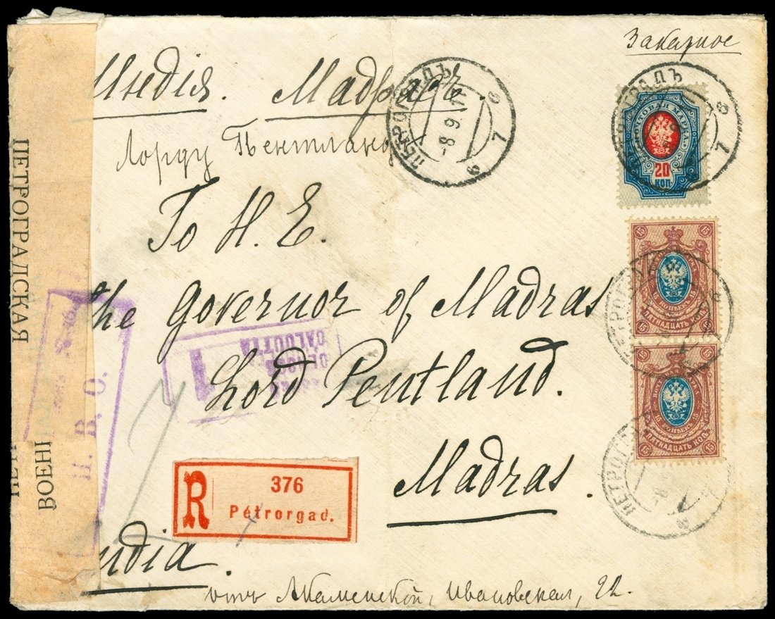 1917 (9/8) Russia registered cover to India, Hong Kong transit (10/26), Madras, India arriving (11/22).