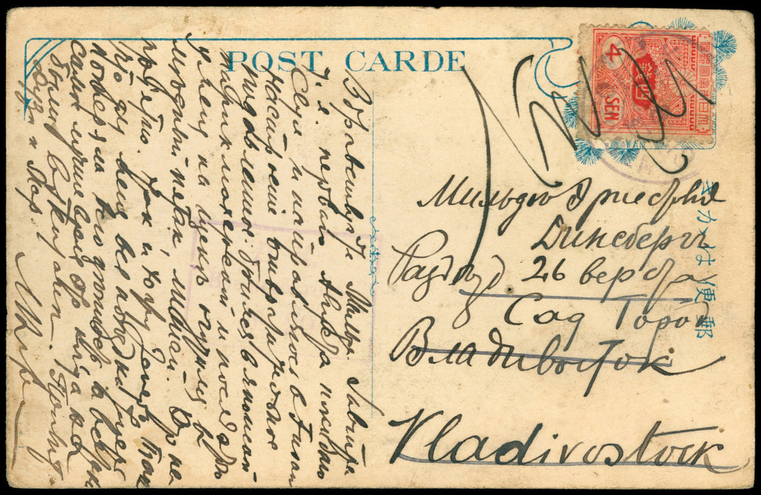 1919 (8/1) Picture Post Card Seoul to Vladivoska, Changchun c.d.s. (8/3), Russia military censor.