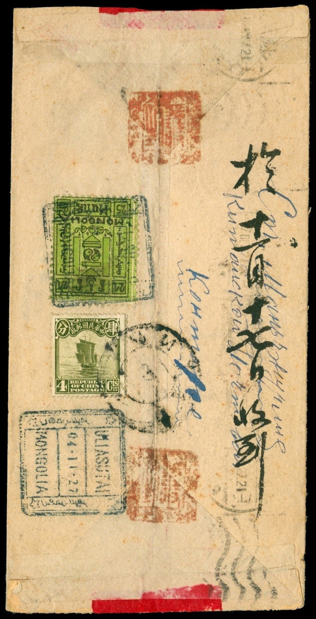 1927 Red band envelope, Uliasutai to Kalgan, combination usage. Manchuli, Peking transit via the Siberia Railway through Russia.