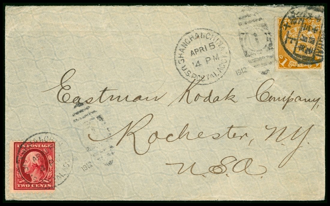1912 (13 Apr.) envelope to Rochester, New Jersey bearing C.I.P. 1c. tied by Shanghai "10" lunar c.d.s. and used in combination with Washington 2c. carmine tied by type VIII Shanghai Postal Agency duplex with a second strike by the Chinese adhesive and there is a faint strike of Shanghai Local Post c.d.s. on the reverse; the envelope with a couple of creases. An unusual combination