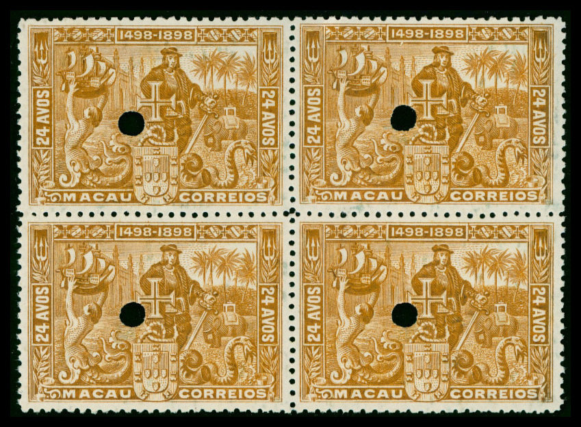 1898 Vasco da Gama ½a. to 24a. set of eight in Waterlow specimen blocks of four (each value with small punch hole), without gum. A fine set. Choi C70-77. Photo