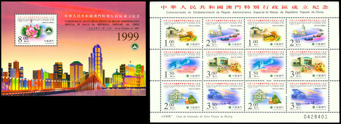 1999 Establishment of Macao as S.A.R. of P.R.C., 1p. To 3.50p. 70 sheets each and 100 miniature sheet. SG1142-1148