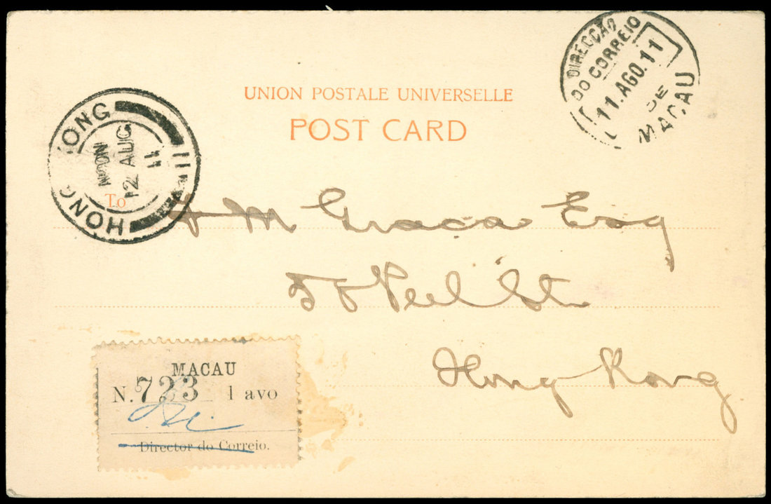 1911 (8/11) Picture Post Card to Hong Kong, postmaster label 1avo stamp, Macau c.d.s. along side. Hong Kong arriving (8/12).
