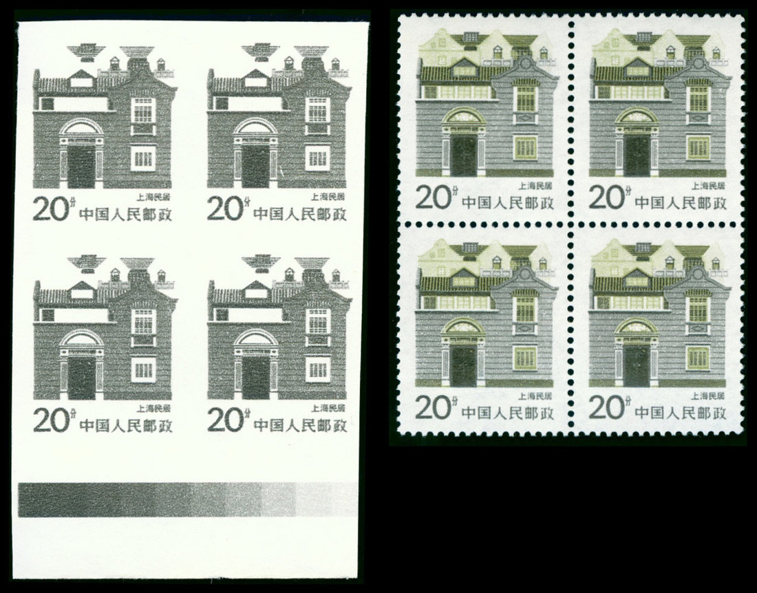 1986 R23 Traditional Houses, 20f. Shanghai House block of four with lower sheet margin, imperf. and missing yellow-olive varieties, and other blocks for comparision. Unused, very scarce. SG 3442.