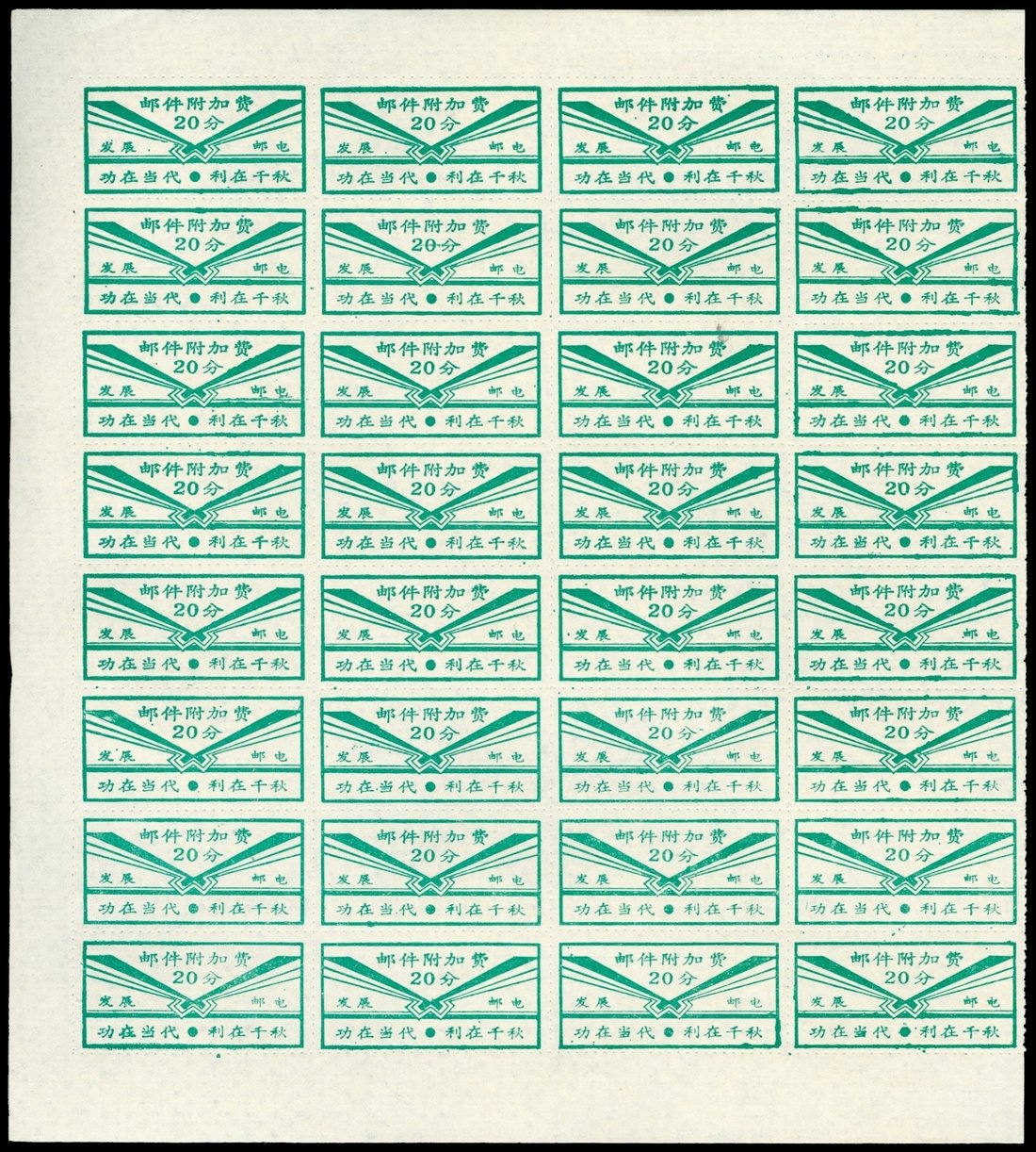 1990's Hubei Yunxian mail surcharges stamps 10c. One sheet of six by six and four blocks of four; 20c. One sheet of eight by four and two blocks of four. (2)