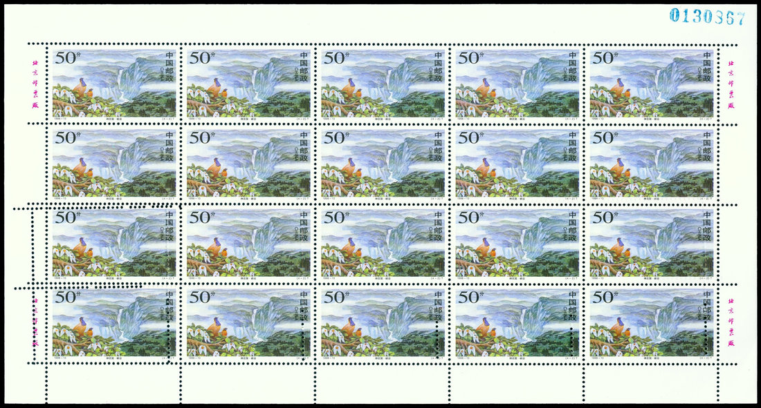 1998 Shennongjia 50f. River gorge, sheet of twenty. Lower 2 rows with double perforation variety. Unmounted mint. SG 4297