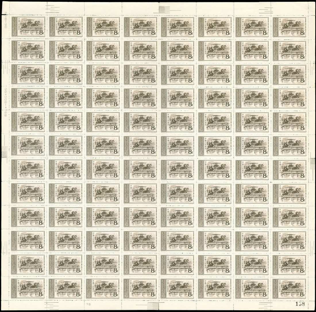 1956 S16, Pictorial Reproducations from Bricks of East Han Dynasty, complete sheet of 96. Centre folded with minor foxing at margin.