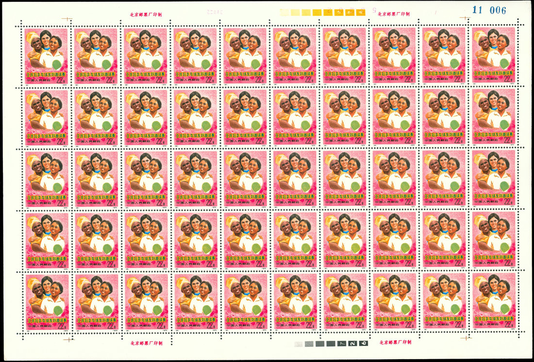 1973 N20 Asian-African-Latin-American Table Tennis Friendship Invitational Tournament, complete sheet of 50. Minor corner tear on one sheet.