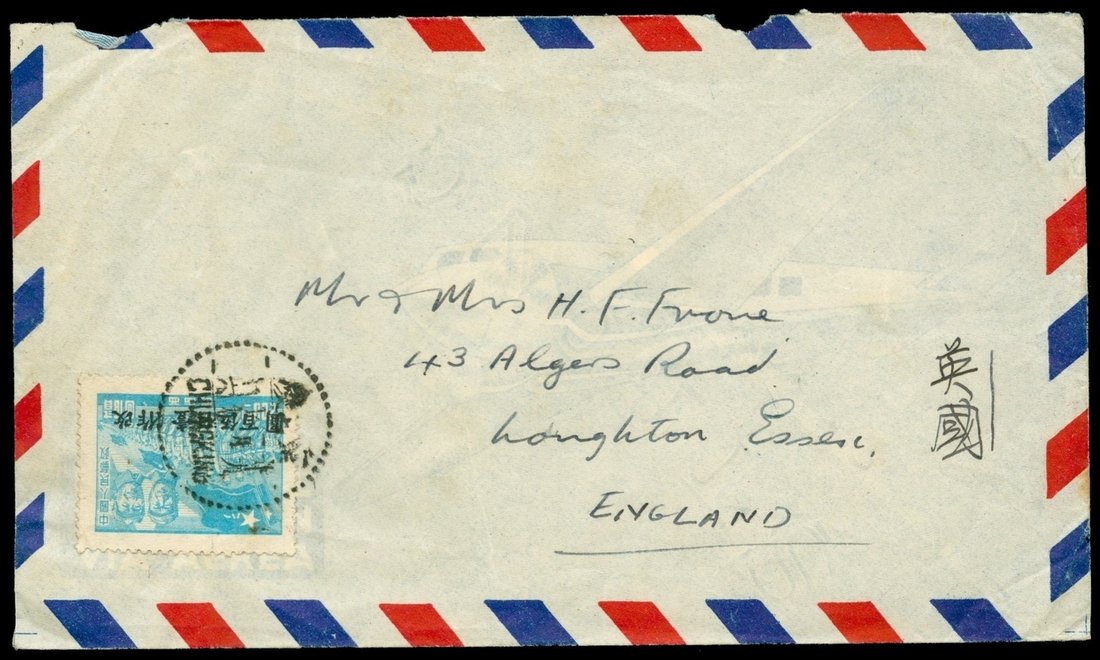 1950 (1/17) Chungking to U.K. via Canton (2/3), $1500 surcharge single franking.