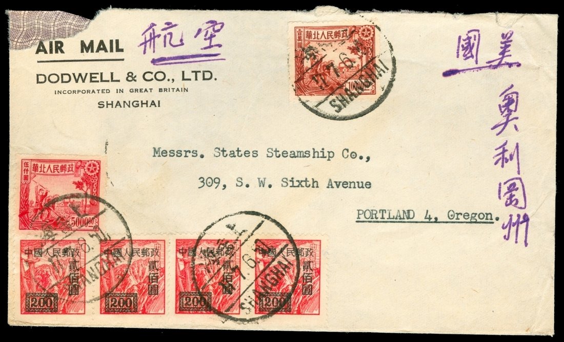 1950 (6/7) Shanghai airmail cover to U.S.A., good combination usage. Total $15800 rate. corner fault.