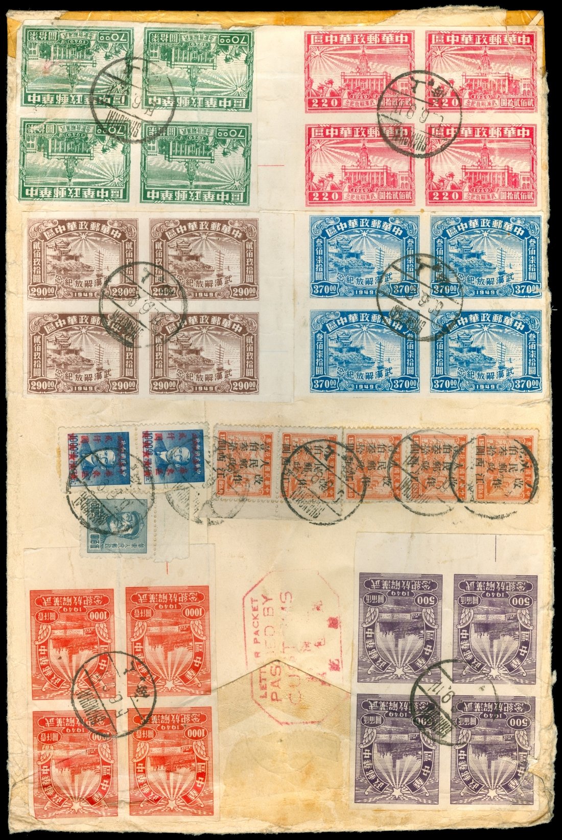 1950 (6/9) Shanghai registered cover to U.S.A., multiple franking including a set of block of four imperf Hankow Liberation.