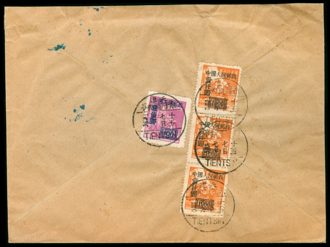 1950 (7 JUL) cover from Tientsin to U.S.A. bearing surcharge $100, $1,000 strip of 3, tied by Tientsin c.d.s..