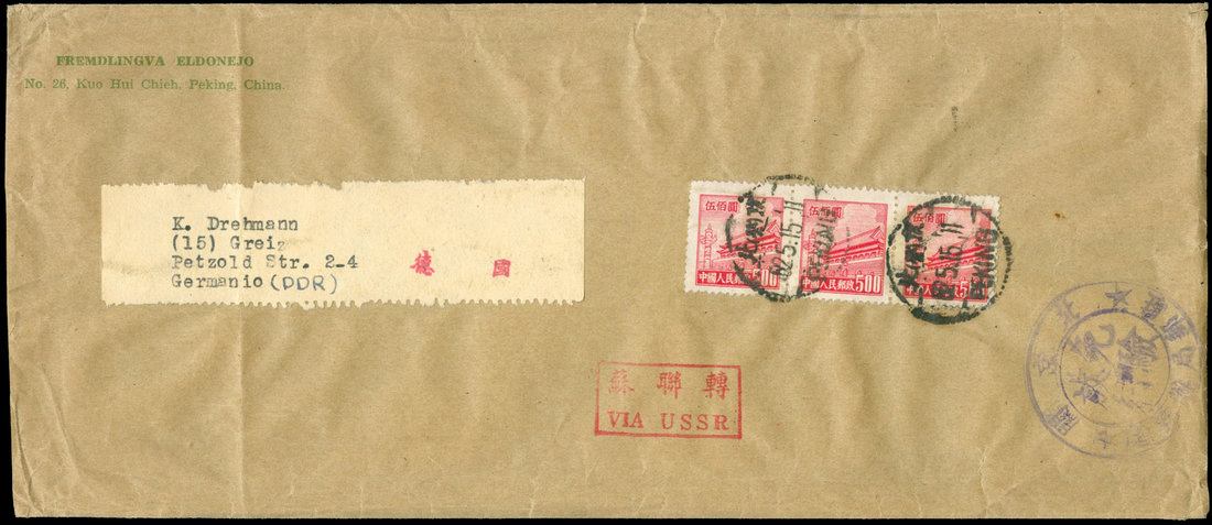 1952 (5/15) Peking Newspaper mail to Germany via USSR, $500 (3) Gate issue. Peking PO Custom Pass chop.