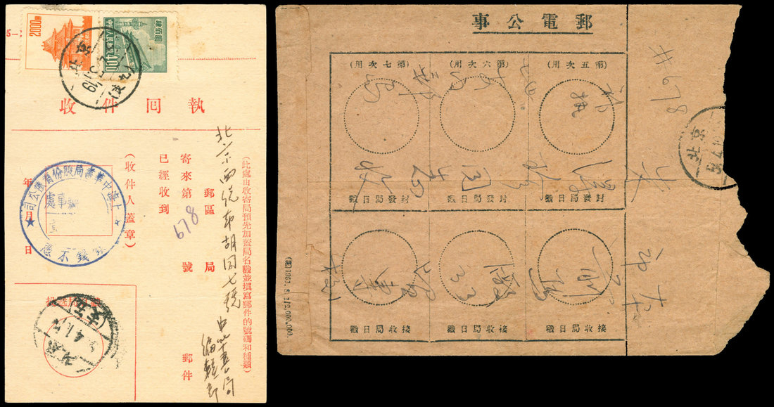 1954 registered receipt return card, R4 $400, R6 $2000 Peking c.d.s. (4/3); Also another same year official envelope for mailing registered receipt, used in Peking.