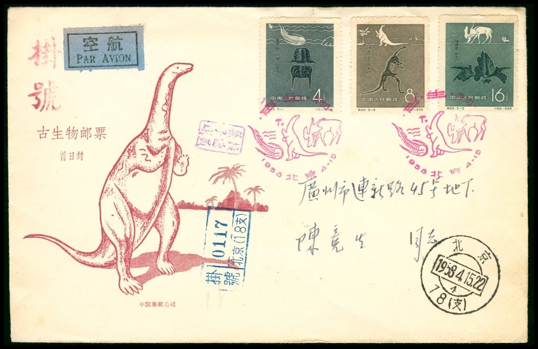1958 (15 APR) S22 Chinese Fossils FDC registered from Peking to Canton, 18 Apr arrival c.d.s., very fine.