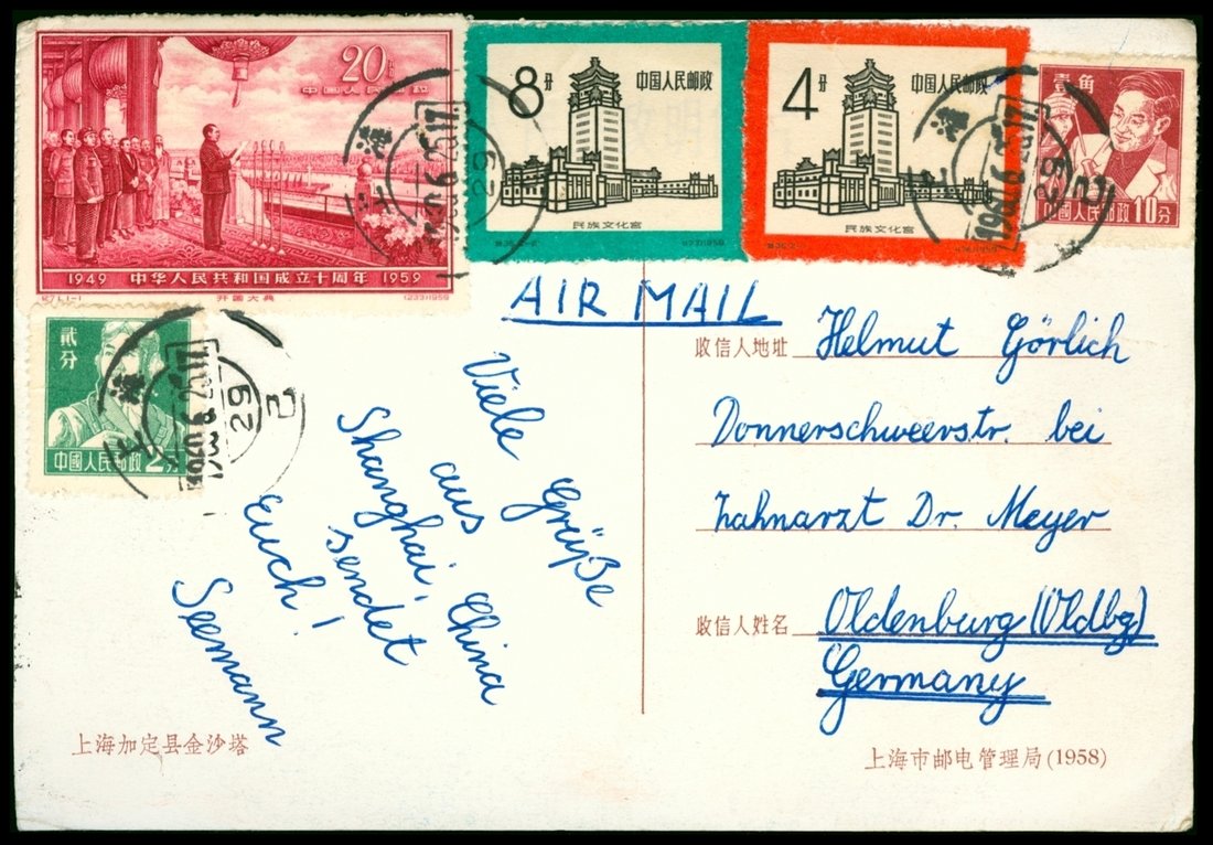 1960 (25 Jun.) Shanghai picture postcard to Germany bearing C71, 43f. Very fine.