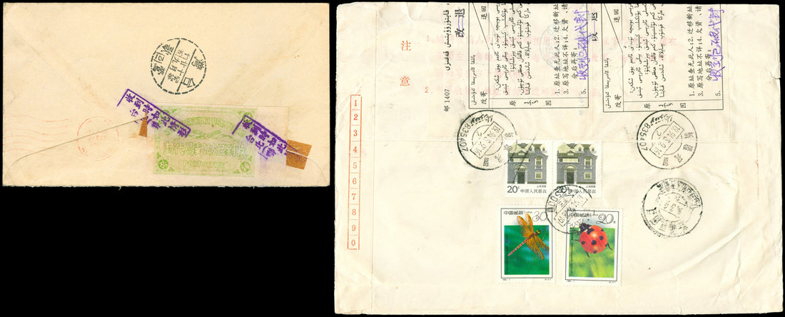 1960-2002 a group of covers bearing Officially Sealed labels with 1960 U.S.A. to Taiwan, the reverse bearing Officially Sealed label tied by two boxed handstamps in violet; 1994 internal cover to Sinkiang bearing from "YU-1047" used temporarily as an officially sealed label and 2002 a group of three Sinkiang covers bearing Officially Sealed labels showing some errors of characters. A good group. (5 covers)