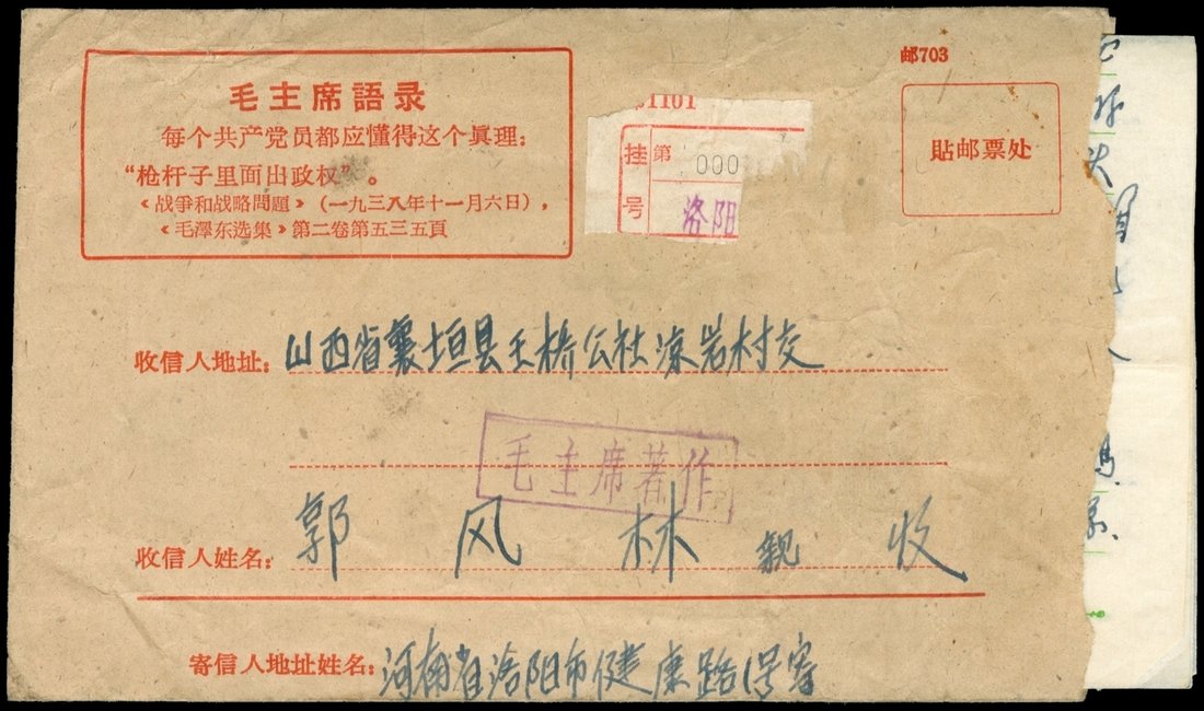 1960's The Cultural Revolution period, from Luoyang Henan to Shanxi registered cover, a purple handstamps "Chairman Mao's writings "on front, meaning is free postage in that age.