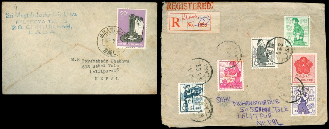 1962s two Lasa, Tibet covers to Nepel including one registered combination cover.