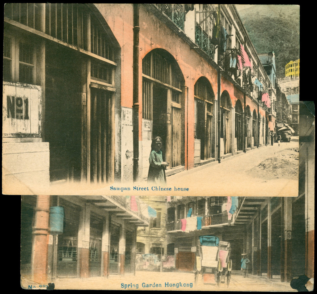 Two early better Street view Picture Post Card: Spring Garden; Sampan Street Chinese House.