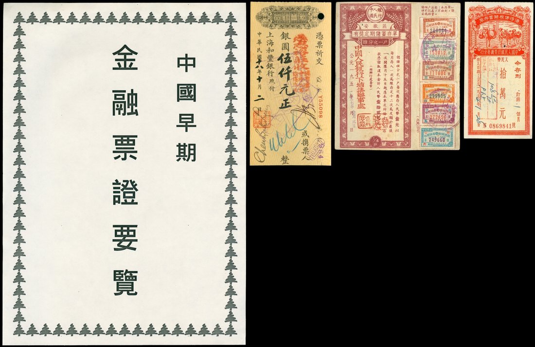 1929-51 Chinese early financial collection stockbook of bank cashier order,savings deposit receipts, bank draft ect., some of unusual, includes 1929 The Shanghai Ho Hong Bank cash check, 1948 The Chartered Bank of India Australia & China check, 1935 Jiansu Province Peasant Bank current savings passbook, good to fine. (46)