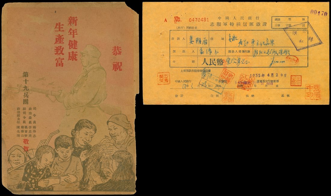 1954-56 Chinese people's volunteer army mail transfer note from People's Bank of China (4), one 1949's New Year card from 19th corps of Chinese army