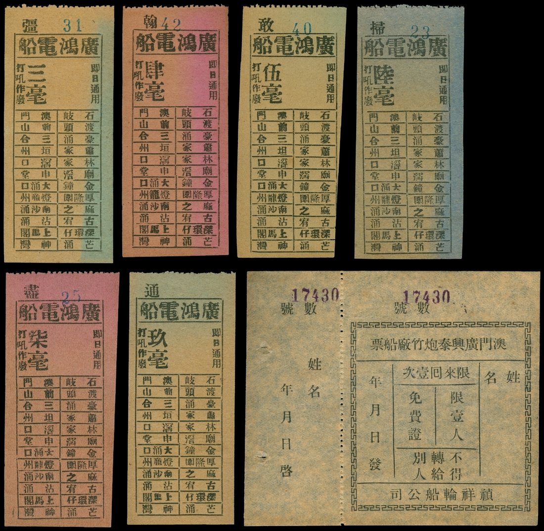 1960's set of six Guang Hong Macau ship tickets and one Guang Xing Macau ship ticket.