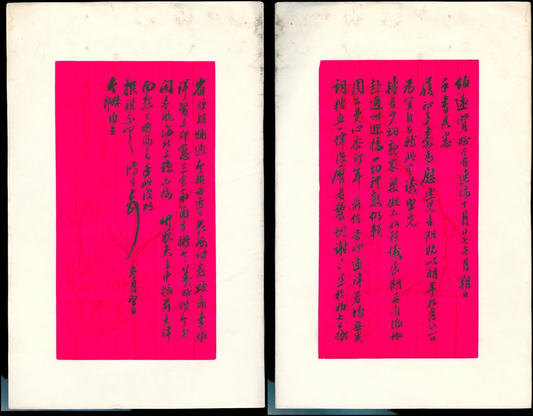 A letter from Li HongZhang, hand writing on red illustrated letter -paper in late Qing Dynasty.(12.5X24cm)X2