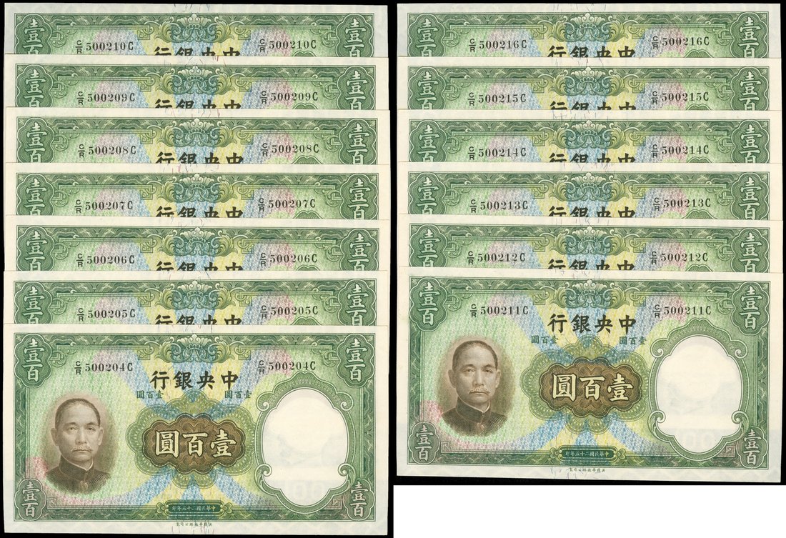 Central Bank of China, a consecutive run of 13 x $100, 1936, serial number C/R 500204C to C/R 500216C, green on multicolour underprint, Sun Yat Sen at left, reverse purple on light blue, temple at centre right,