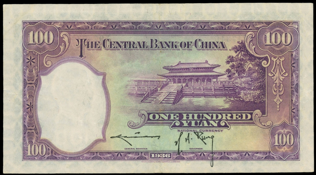 Central Bank of China, 100 yuan, 1936, serial number A/N 974734C, green on multicoloured, Sun Yat Sen at left, watermark of himself at right, palace structure on reverse, this the scarce variety with the LARGE SIGNATURE ON THE REVERSE,