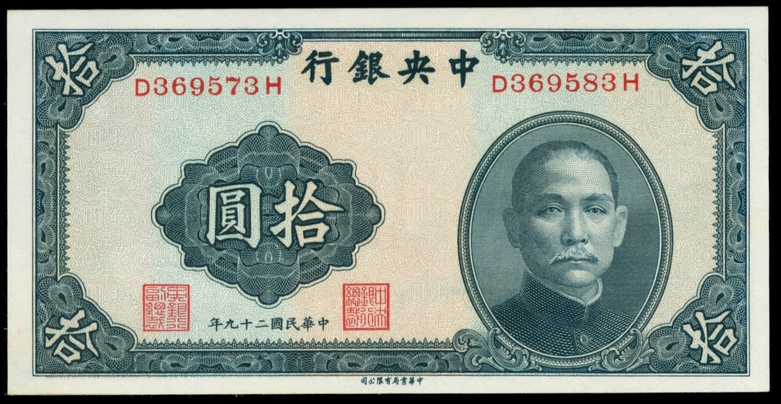 Central Bank of China, 10 yuan, 1940, serial number error, D369573H/D369583H, blue-green on pale green and pink underprint, Sun Yat Sen at right, reverse grey green,