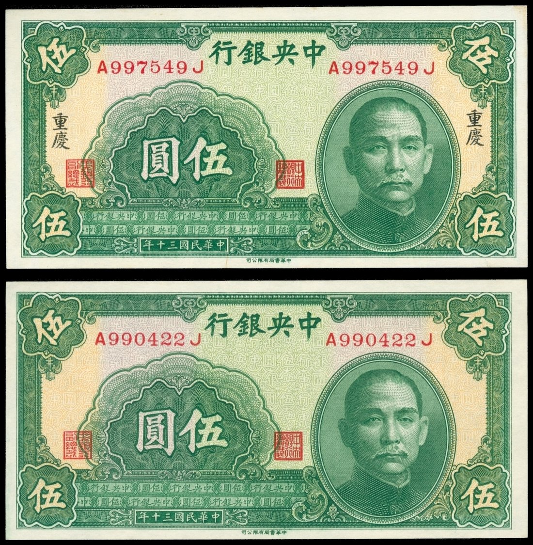 Central Bank of China, a pair of 5 yuan, one from Chungking, the other without place name, 1941, serial number A990422J and A997569J, green on multicolour underprint, Sun Yat Sen at right, reverse green,