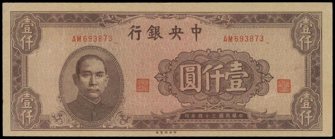 Central Bank of China, 1000 yuan, 1945, serial number AM693873, brown, Sun Yat Sen at left, reverse brown,