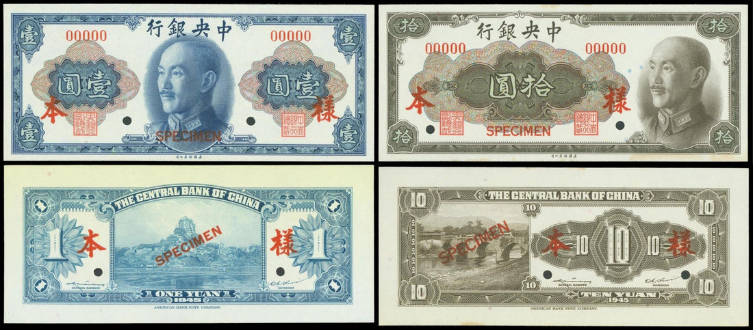 Central Bank of China, lot of 2 specimens, 1 and 10 Gold Yuan, 1945, uniface obverse and reverse pairs, blue and brown respectively, Chiang Kai Shek on obverse,