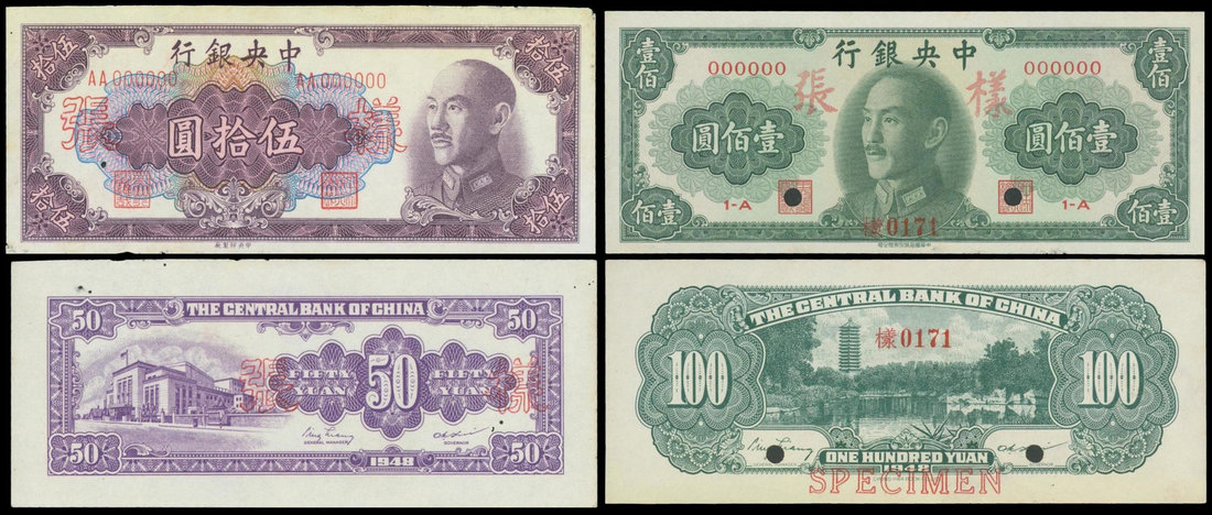 Central Bank of China, lot of 2 specimens, 50 and 100 Gold Yuan, 1948, uniface obverse and reverse pairs, purple and green respectively, Chiang Kai Shek on obverse,
