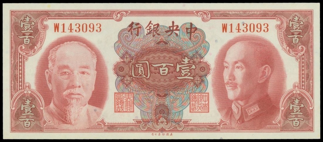 Central Bank of China, 100 yuan, 1945, serial number W143093, red on multicolour, Lin Sen and China Kai Shek at left and right respectively,