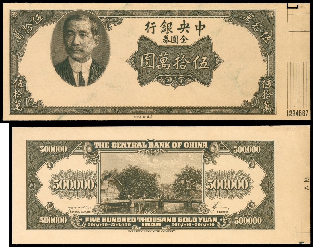 Central Bank of China, uniface obverse and reverse die proof of 500,000 gold yuan, 1949, unissued, black on white, bust of Sun Yat Sen at left on obverse, reverse black, people walking on stone bridge at centre,