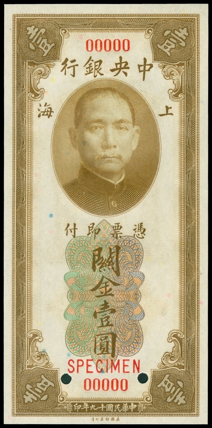 Central Bank of China, 1 CGU, specimen, 1930, red serial number 00000, olive-brown and multicolour guilloche, vertical format, Sun Yat Sen at top centre, reverse olive-brown, bank building at centre, hole punch cancelled, ‘SPECIMEN’ overprinted in red,