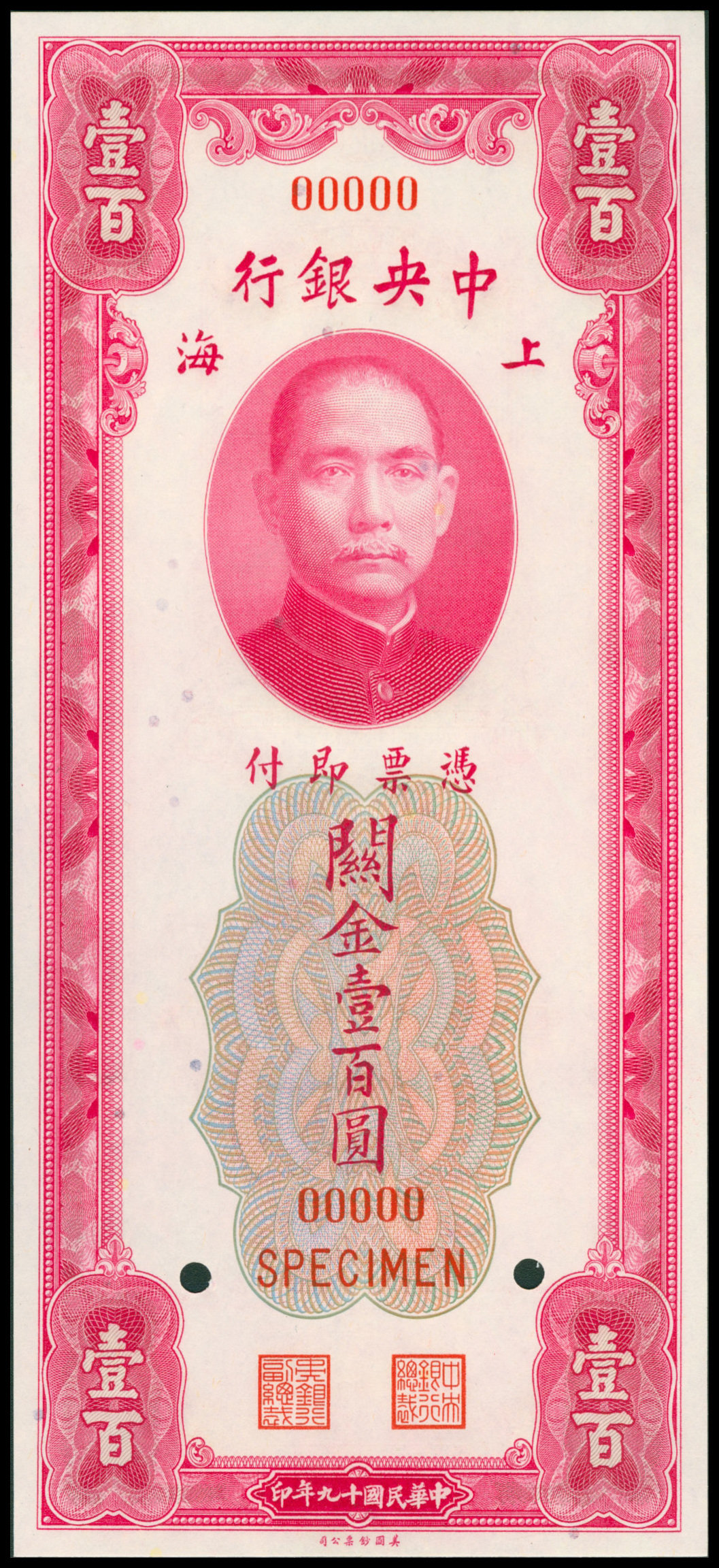 Central Bank of China, 100 CGU, 1930, specimen, red serial number 00000, red and multicolour gulliloche, vertical format, Sun Yat Sen at top centre, reverse red, bank building at top centre,