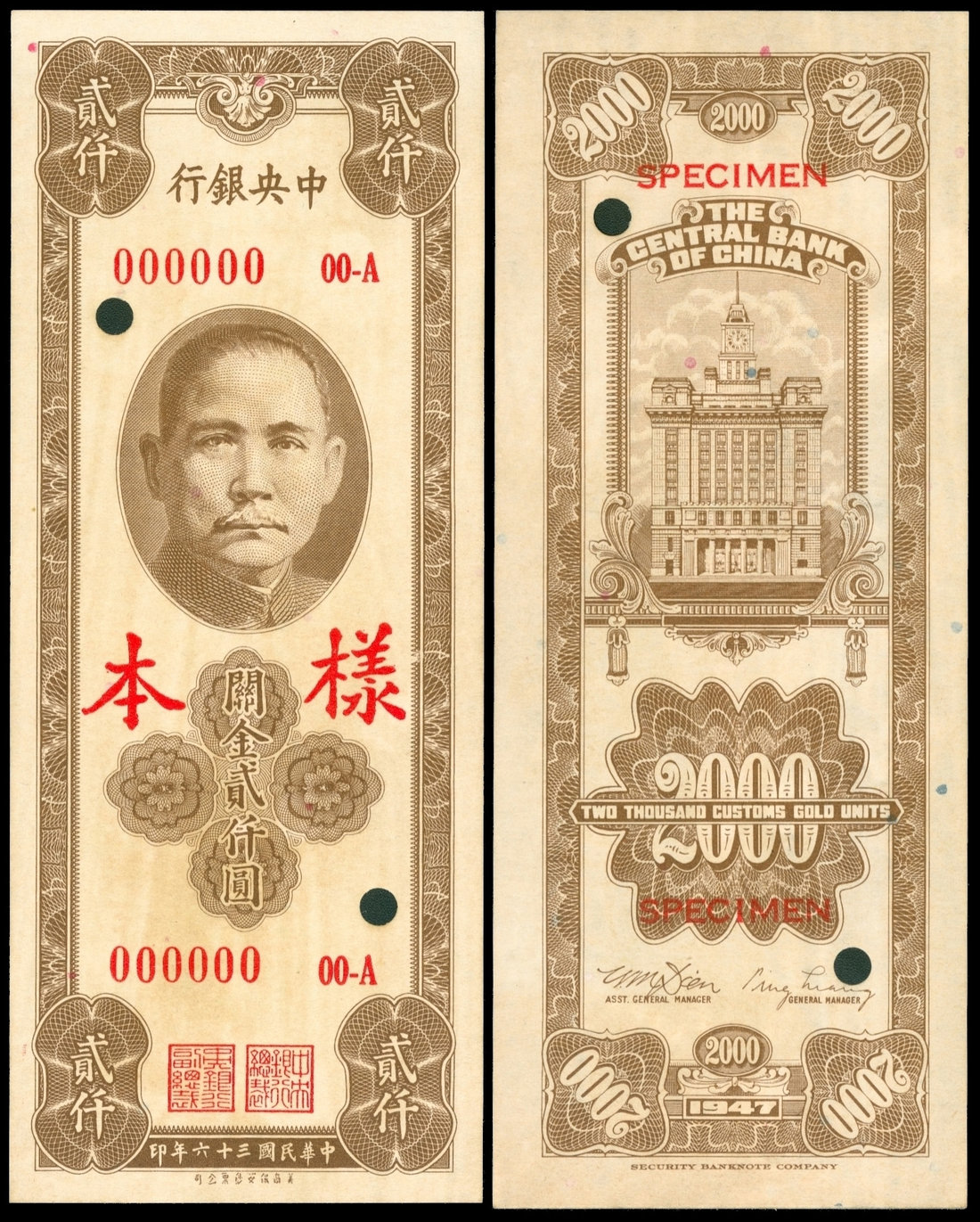 Central Bank of China, 2000 CGU, uniface obverse and reverse specimens, 1947, serial number S318415 and S318992, vertical format, brown , Sun Yat Sen at upper centre,