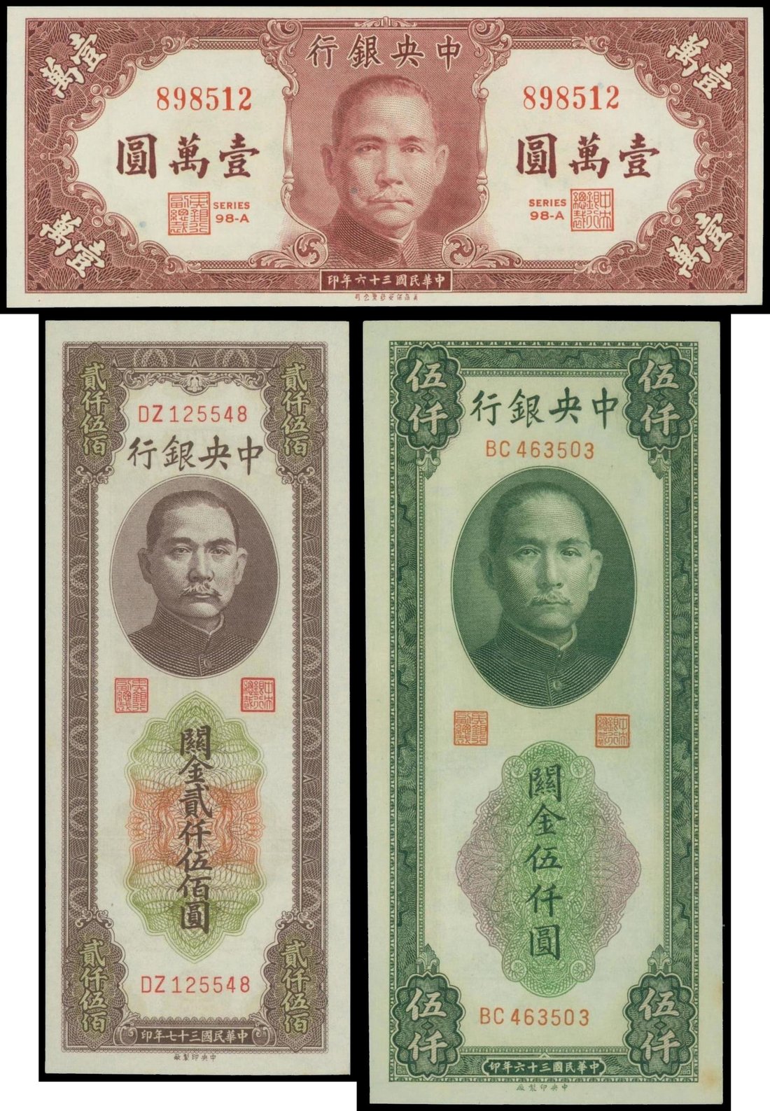 Central Bank of China, group of 3 notes, consisting of: 10,000 yuan, lilac 1947, 2500 CGU 1948, 5000 CGU 1947,