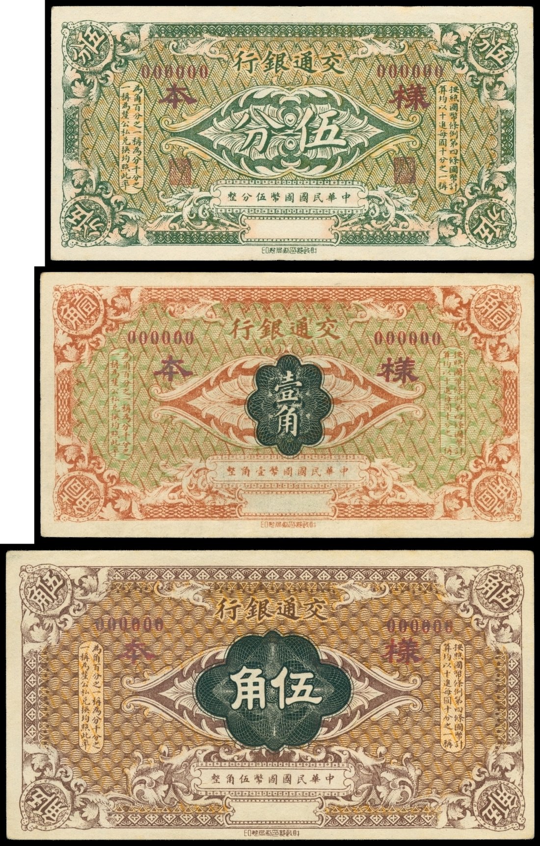 Bank of Communications, a lot of 5 fen, 1 and 5 chiao, specimen, ND(1914), green, red, brown on multicolour underprint, similar design, reverse English text,