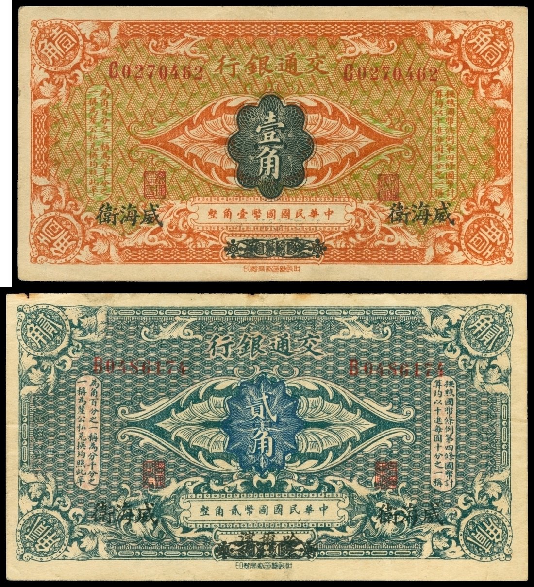 Bank of Communications, 1 and 2 chiao, ND(1914), serial number C0270482, B0486174, orange on light green underprint, dark blue on pink underprint respectively, reverse English text,