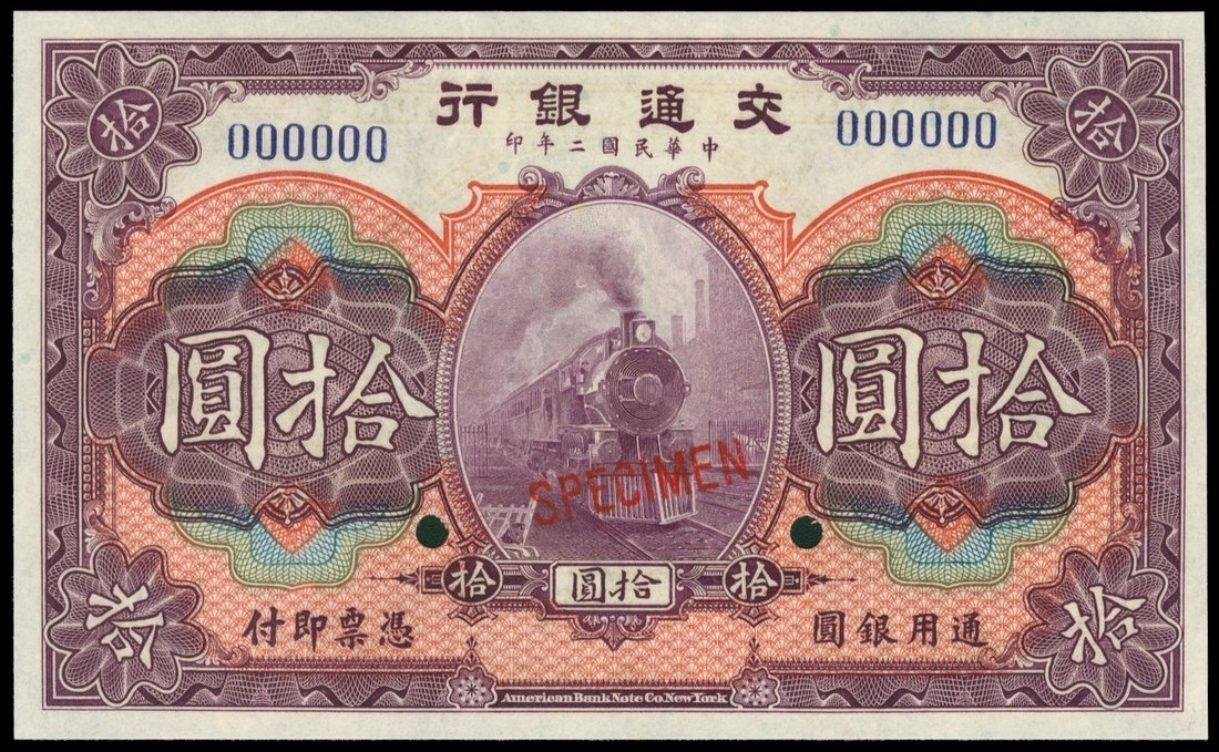 Bank of Communications, $10, 1913, specimen, purple and multicolour underprint, steam train at centre, reverse purple, hole punch cancelled, 'SPECIMEN' overprint in red,