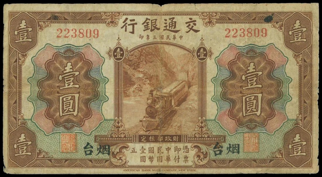 Bank of Communications, 1 yuan, Chefoo, 1914, serial number 223809, brownon multicolour, steam passenger train at centre, reverse brown, sailing ship,