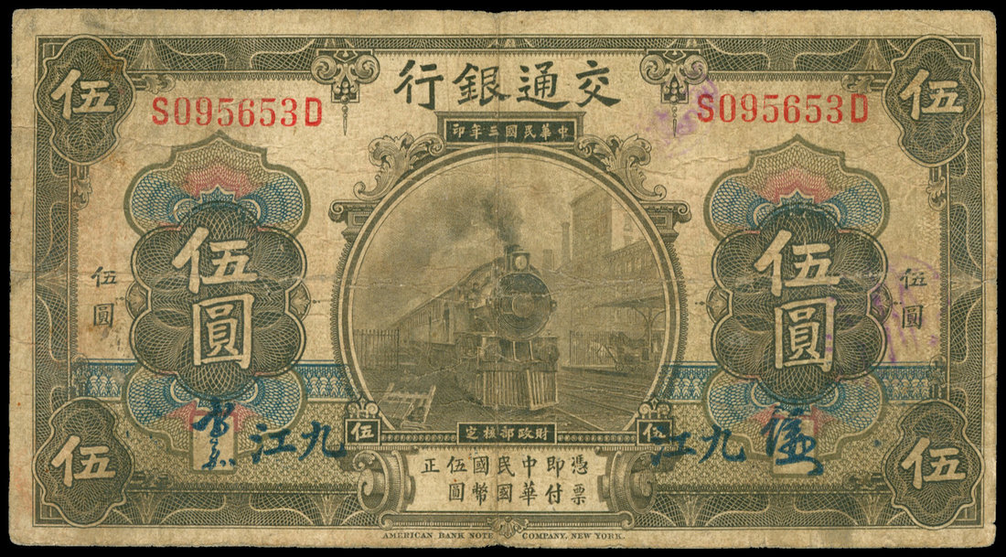 Bank of Communications, 5 yuan, Kiukiang, 1914, serial number S095653D, brown on multicolour, steam passenger train at centre, '5' at each corner, reverse blue, post office building at centre, manuscript signatures bottom left and right,