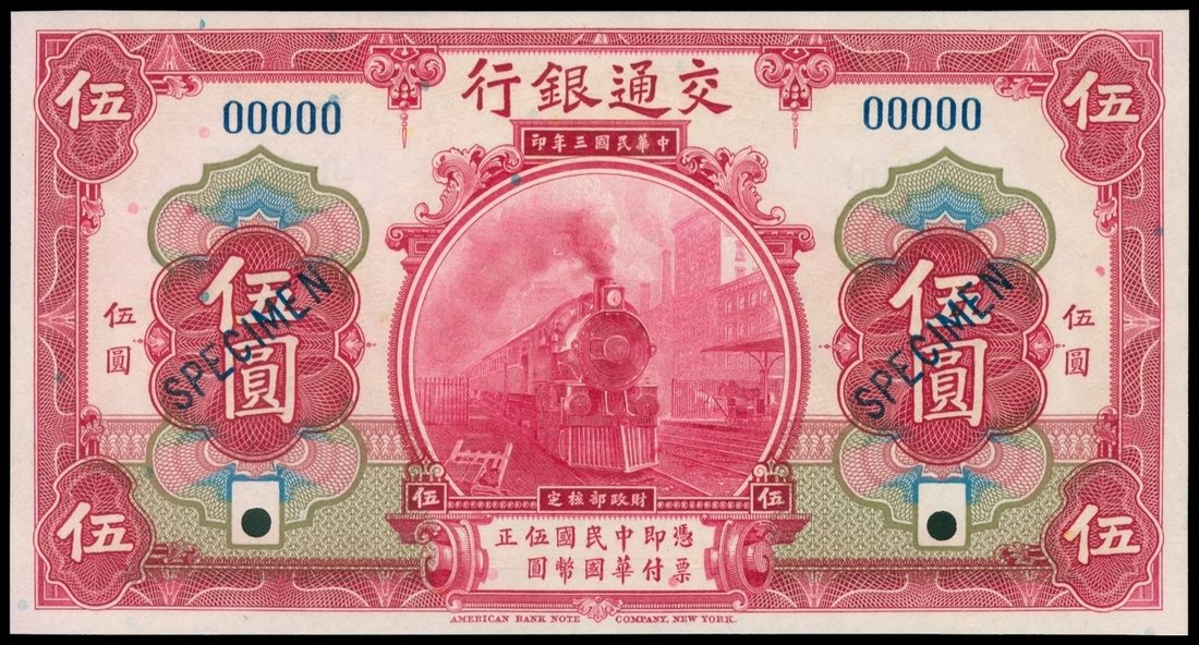Bank of Communications, 5 yuan, 1914, specimen, red and multicolour underprint, steam train at centre, reverse red, bank building at centre, hole punch cancelled, 'SPECIMEN' overprint in red,