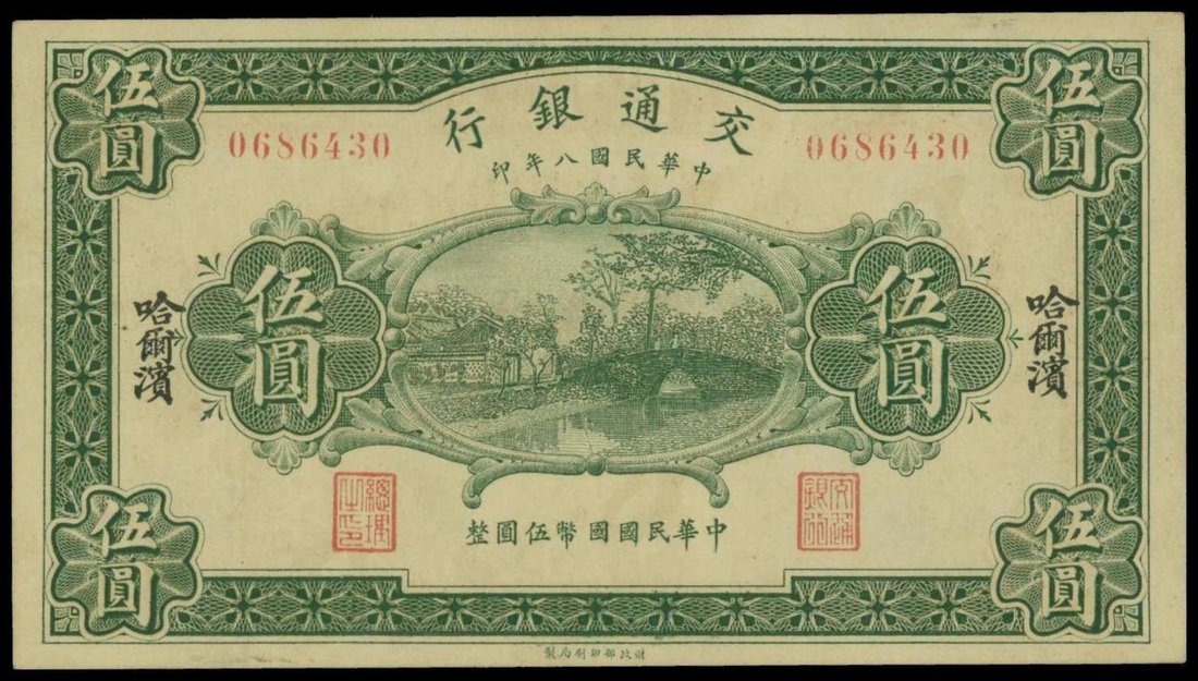 Bank of Communications, 5 yuan, Harbin, serial number 0686430, green, stone bridge over stream at centre, red seal signatures, reverse orange and light blue,
