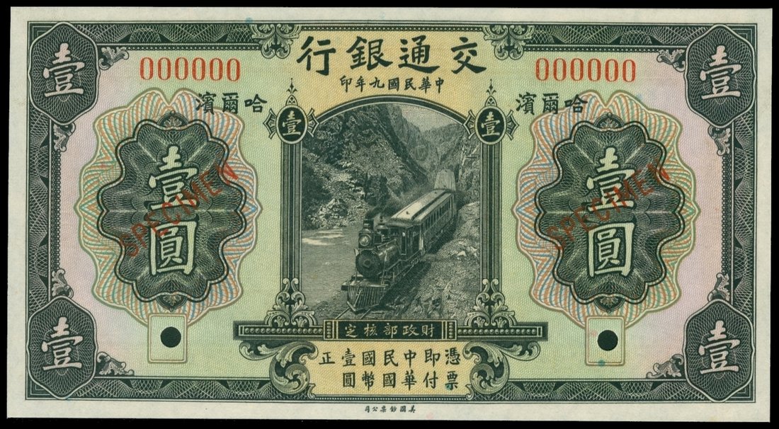 Bank of Communications, 1 yuan, specimen, Harbin, 1920, serial number 000000, black on multicolour, steam passenger train at centre, reverse brown, sailing masted ship on sea, English and Russian text, hole punch cancelled, 'SPECIMEN' overprint in red,
