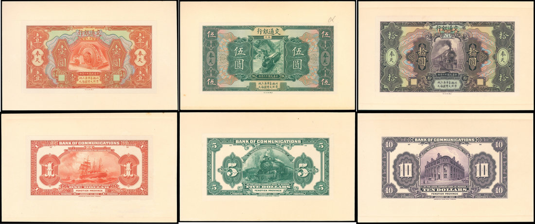 Bank of Communications, set of 3 proofs, 1. 5 and 10 yuan, Fengtien, 1923, uniface obverse and reverse pairs, orange, green and purple respectively,